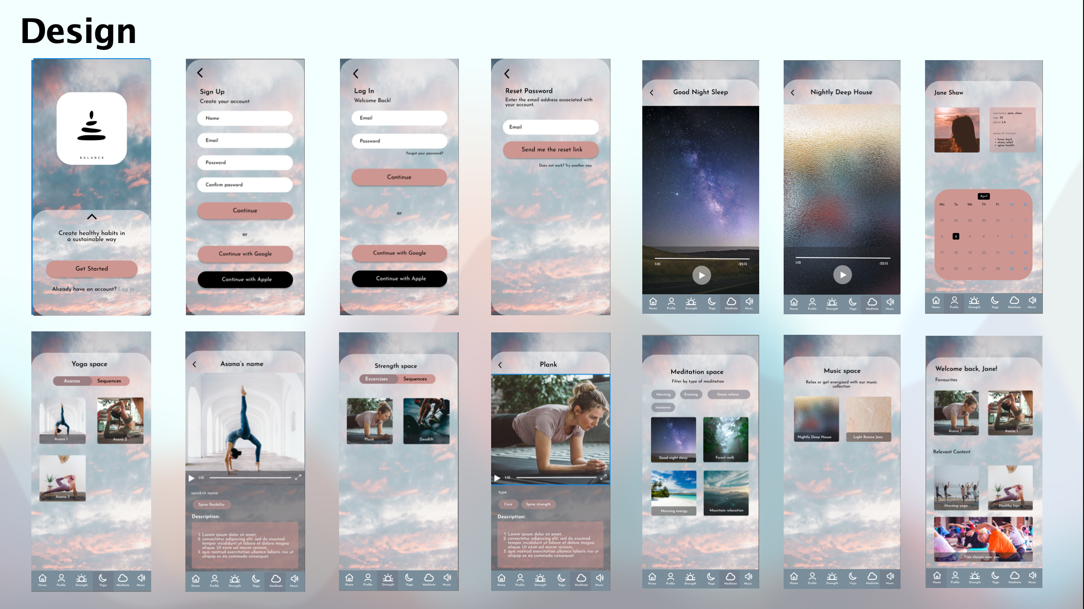 As a UX designer for a yoga and meditation Balance app, my mission was to create an intuitive and immersive experience that enables users to find inner peace and balance with ease. I strive to design a visually captivating interface that reflects the serenity and tranquility of the practices, ensuring a seamless flow from one feature to another. By understanding the users' needs and goals, I aim to create an app that guides them through their yoga and meditation journey, providing a sense of clarity, focus, and mindfulness. Through thoughtful interactions, personalized recommendations, and a supportive community, I aim to enhance the user's well-being and create a harmonious digital space for their inner exploration and growth.